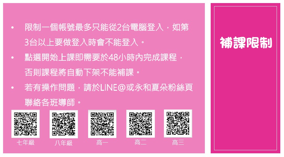 每日上線課程將於粉專、官網與各年級LINE@公告,再請密切注意課程資訊!